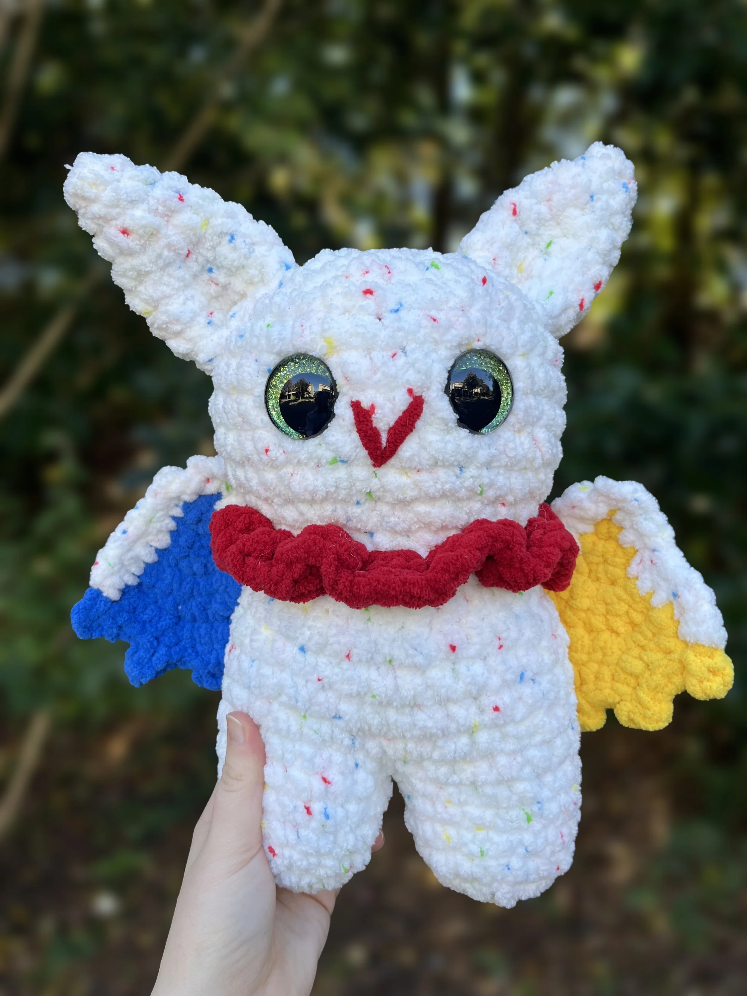 I make lots of cryptid-inspired plushies and I love using elements such as buttons for eyes in my work. I also love making clown-themed plushies, and am most well-known at local markets for my clown cats and bunnies. I use a lot of bunnies in my work, as they are my favorite animals. My business mascot is modeled off my pet bunny, Astro!